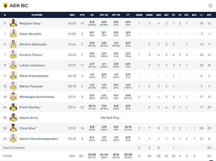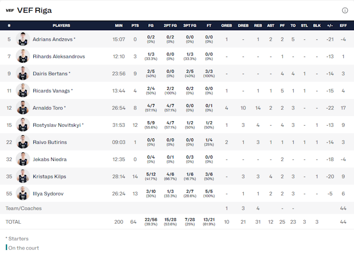 Ο Μπάρτλεϊ ήταν ο κορυφαίος των «κιτρινόμαυρων» με 23 πόντους, 3 ριμπάουντ και 4 ασίστ ενώ 16 πόντους με 9 ριμπάουντ είχε ο Σίλβα. Για τη Ρίγα πρώτος σκόρερ ήταν ο Κλιπς με 14 πόντους ενώ 13 είχε ο Σιντόροφ και 12 ο Νοβίτσκι.