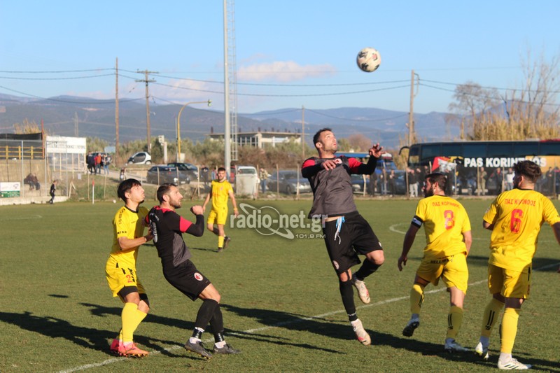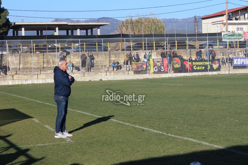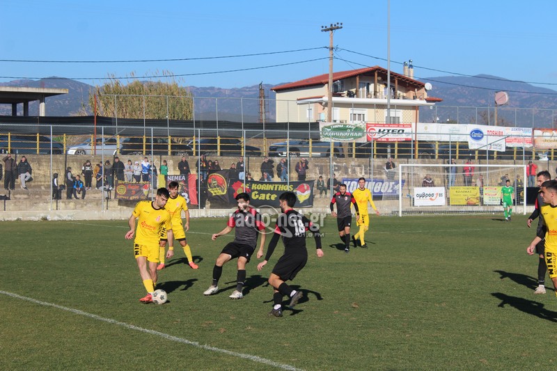 Το πρώτο ημίχρονο δεν επεφύλασσε κάποιο ουσιαστικό θέαμα με τις δύο ομάδες να παίζουν αναγνωριστικά για μεγάλο διάστημα. Πιο τυχερή η ομάδα της Κορίνθου καθώς στο 30ο λεπτό έπειτα από κερδισμένη κόντρα βγήκε η αντεπίθεση από δεξιά. Ο Αλμπάνης ξέφυγε και εν τέλη μοίρασε στον Παπουλή ο οποίος πλάσαρε από κοντά νικώντας τον Τσάμη για το 0-1.