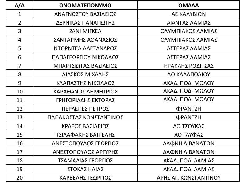 Οι παρακάτω ποδοσφαιριστές αποτελούν την αποστολή της Μικτής ομάδας Κ-16 της Ε.Π.Σ. ΦΘΙΩΤΙΔΑΣ που θα αγωνισθεί την ΤΕΤΑΡΤΗ 20/11/2024 και ώρα 15.00 με την Ε.Π.Σ. ΦΩΚΙΔΑΣ στο Ενωσιακό Αθλητικό Κέντρο της Ε.Π.Σ. ΦΩΚΙΔΑΣ για το Πανελλήνιο Πρωτάθλημα Ε.Π.Σ. περιόδου 2024 – 2025.