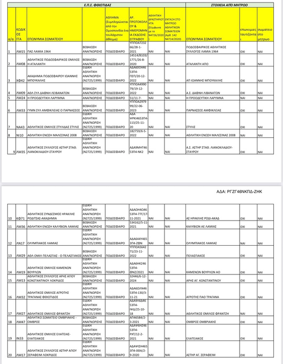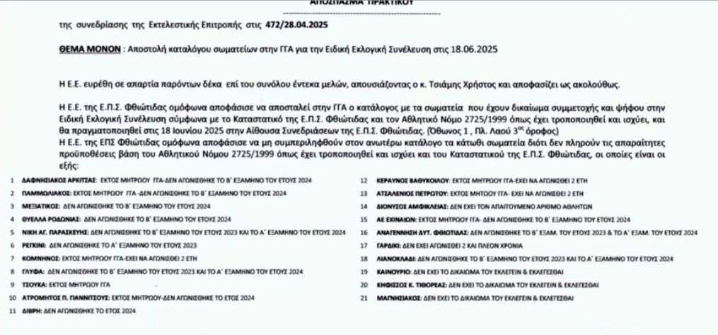 Η Γενική Γραμματεία Αθλητισμού επικύρωσε τον κατάλογο των σωματείων που έχουν δικαίωμα συμμετοχής και ψήφου στη γενική συνέλευση αρχαιρεσιών της ΕΠΣ Φθιώτιδας που θα διεξαχθεί στις 18 Ιουνίου.