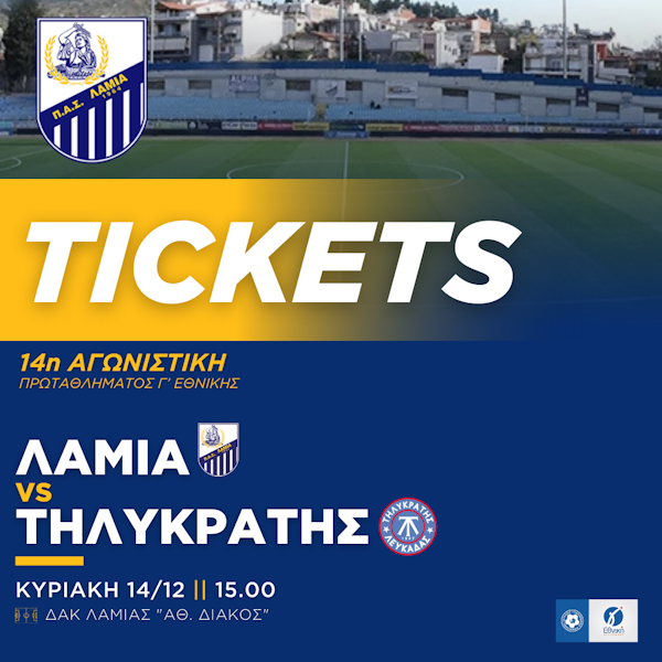 Για τον αγώνα της 14ης αγωνιστικής του Πρωταθλήματος της Γ΄ Εθνικής κατηγορίας απέναντι στον Τηλυκράτη Λευκάδας, που θα διεξαχθεί στο ΔΑΚ Λαμίας “Αθ. Διάκος” την Κυριακή 14/12 και ώρα 15:00, ο ΠΑΣ ΛΑΜΙΑ 1964 ενημερώνει τους φιλάθλους που θέλουν να προμηθευτούν εισιτήριο τα εξής: