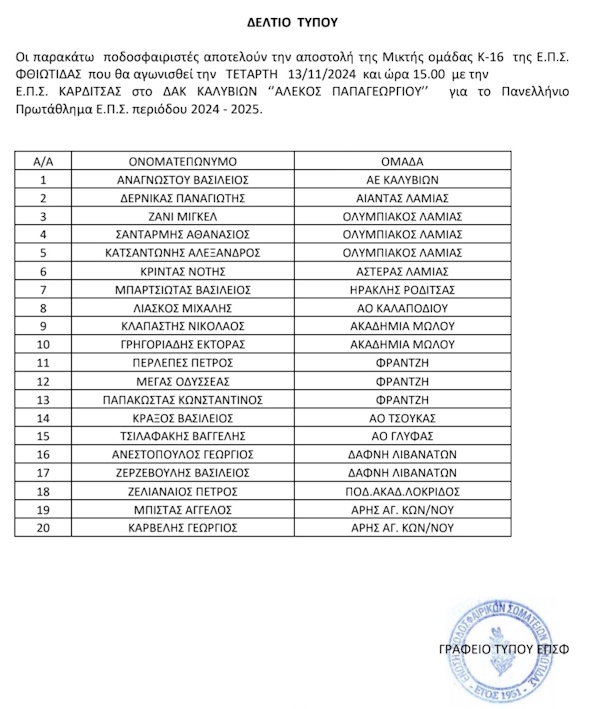 Οι παρακάτω ποδοσφαιριστές αποτελούν την αποστολή της Μικτής ομάδας Κ-16 της Ε.Π.Σ. ΦΘΙΩΤΙΔΑΣ που θα αγωνισθεί την ΤΕΤΑΡΤΗ 13/11/2024 και ώρα 15.00 με την Ε.Π.Σ. ΚΑΡΔΙΤΣΑΣ στο ΔΑΚ ΚΑΛΥΒΙΩΝ ‘’ΑΛΕΚΟΣ ΠΑΠΑΓΕΩΡΓΙΟΥ’’ για το Πανελλήνιο Πρωτάθλημα Ε.Π.Σ. περιόδου 2024 – 2025.