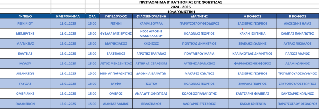 Οι ορισμοί των διαιτητών για την 13η αγωνιστική της Α’ κατηγορίας και της 10ης αγωνιστικής της Β’ κατηγορίας Φθιώτιδας.
