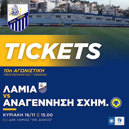 Για τον αγώνα της 10ης αγωνιστικής του Πρωταθλήματος της Γ΄ Εθνικής κατηγορίας απέναντι στην Αναγέννηση Σχηματαρίου, που θα διεξαχθεί στο ΔΑΚ Λαμίας “Αθ. Διάκος” την Κυριακή 16/11 και ώρα 15:00, ο ΠΑΣ ΛΑΜΙΑ 1964 ενημερώνει τους φιλάθλους που θέλουν να προμηθευτούν εισιτήριο τα εξής: