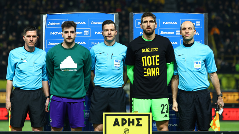 *Οι ποδοσφαιριστές του Άρη εμφανίστηκαν στον αγωνιστικό χώρο φορώντας μαύρα t-shirt (με το μήνυμα «Ποτέ Ξανά) τιμώντας τη μνήμη του Άλκη Καμπανού, τρία χρόνια (1/2/2022) μετά τη στυγερή δολοφονία του.