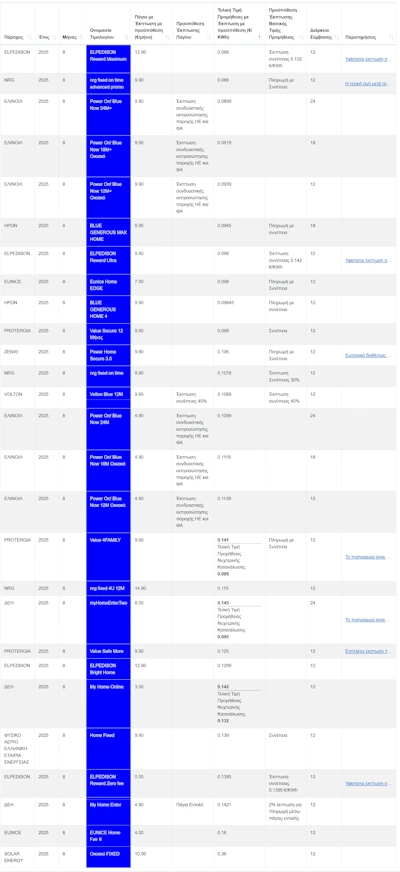Διαφορετική είναι η κατάσταση στα μπλε, σταθερά τιμολόγια, όπου βρίσκει κανείς αρκετές τιμές κάτω από τα 10 λεπτά ανά κιλοβατώρα.