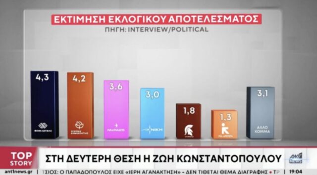 Στην δεύτερη θέση με ποσοστό 15,2% βρίσκεται το κόμμα της Ζωής Κωνσταντοπούλου Πλεύση Ελευθερίας σύμφωνα με την νέα δημοσκόπηση της Interview για την εφημερίδα Political.