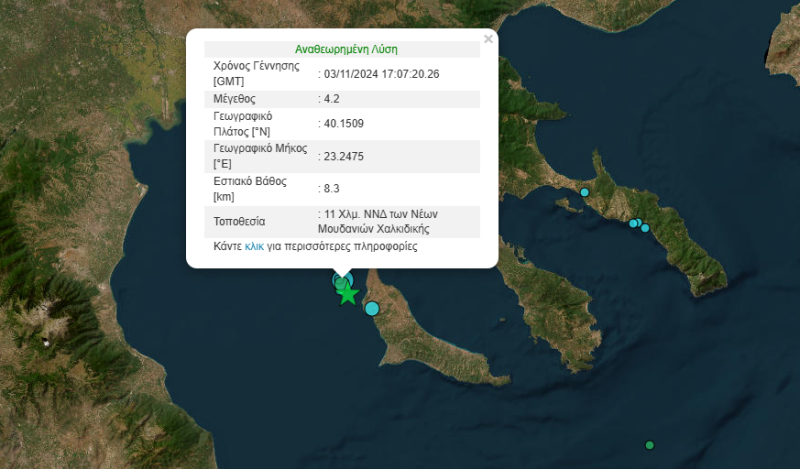 Ας σημειωθεί ότι την περασμένη Πέμπτη στη 01:23 μετά τα μεσάνυχτα καταγράφηκε σεισμική δόνηση 3,9 Ρίχτερ από το ίδιο επίκεντρο, 14 χλμ νότια νοτιοδυτικά των Νέων Μουδανιών, στο θαλάσσιο χώρο.