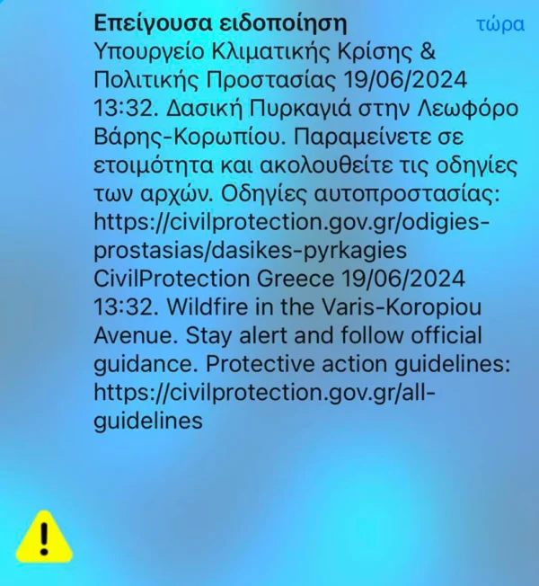 Συναγερμός έχει σημάνει από το μεσημέρι της Τετάρτης 19/6 για τη δασική φωτιά στη Βάρης-Κορωπίου, ενώ προειδοποιητικά μηνύματα εστάλησαν από το 112. «Παραμείνετε σε ετοιμότητα και ακολουθείτε τις οδηγίες των Αρχών», αναφέρεται στο πρώτο μήνυμα που έφτασε στους πολίτες.