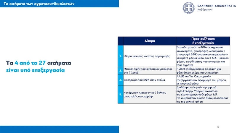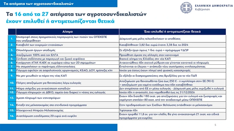 Ειδικότερα, από τα 27 αιτήματα των αγροτών, 16 έχουν επιλυθεί ή αντιμετωπίζονται θετικά, τέσσερα βρίσκονται υπό επεξεργασία και επτά κινούνται εκτός δημοσιονομικών ορίων ή ευρωπαϊκού πλαισίου, ανέφερε ο Κωστής Χατζηδάκης