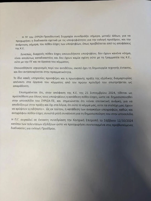 Η Π.Γ. συγκαλεί σε έκτακτη συνεδρίαση την Κεντρική Επιτροπή το Σάββατο 12/10/2024 κατόπιν των τελευταίων εξελίξεων ώστε να προχωρήσει συντεταγμένα στις προβλεπόμενες διαδικασίες για εκλογή Προέδρου.
