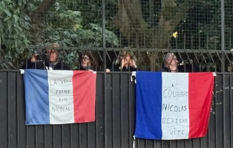 Την ίδια στιγμή, μπροστά από τη φυλακή, υποστηρικτές του -ανάμεσά τους και οι γιοι του- κρατούσαν τη γαλλική σημαία με τον σταυρό της Λορραίνης, δηλώνοντας ανοιχτά τη στήριξή τους.