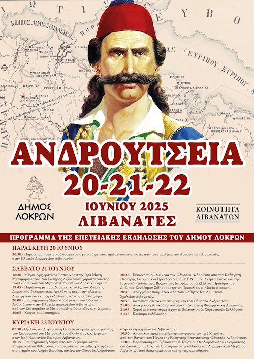 Οι εκδηλώσεις μνήμης προς τιμήν του οπλαρχηγού Οδυσσέα Ανδρούτσου, θα πραγματοποιηθούν στις Λιβανάτες το τριήμερο 20, 21 & 22 Ιουνίου 2025.