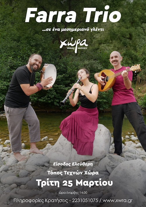 Το μεσημέρι της Τρίτης 25 Μαρτίου 2025, στον Τόπο Τεχνών “Χώρα”, στα Λελέικα Υπάτης, φιλοξενούμε το «Farra Trio», τον Θάνο Γεωργόπουλο και τη Δάφνη Παπαστρατή και τον Σταμάτη Μπενέτα σε ένα μεσημεριανό γλέντι με ελεύθερη είσοδο με μουσικές και τραγούδια από τις Κυκλάδες ως τη Θράκη!