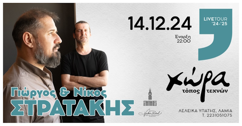 Το Σάββατο 14 Δεκεμβρίου 2024, έχουμε την χαρά να υποδεχτούμε για άλλη μία φορά στον Τόπο Τεχνών «Χώρα», στα Λελέικα Υπάτης, τους “πλανόδιους μουσικούς” Γιώργο και Νίκο Στρατάκη και όλη την μουσική τους ομάδα, μετά την επιτυχημένη καλοκαιρινή τους περιοδεία, για μια γιορτινή μουσική συνάντηση.