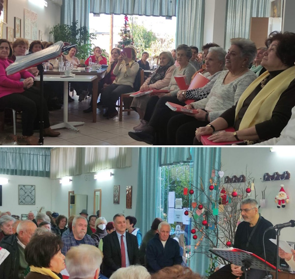 Η εκδήλωση περιλάμβανε εορταστικό πρόγραμμα από τη θεατρική ομάδα του Β΄ ΚΑΠΗ «Ηλιοκαμένοι» και τη χορωδία του, που απέσπασαν το θερμό χειροκρότημα. Ιδιαίτερη ήταν η συμβολή του σκηνοθέτη Κώστα Πασπάλη, καθώς και του μουσικού Δημήτρη Γκαραβέλη που πλαισίωσε μουσικά τη γιορτή. Στο τέλος μοιράστηκαν χριστουγεννιάτικα γλυκά και ευχετήριες κάρτες, προσφορά των μελών του ΚΑΠΗ.
