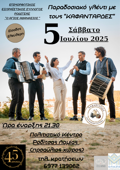 Ο Δήμος Λαμιέων και ο Επιμορφωτικός Εξωραϊστικός Σύλλογος Ροδίτσας «Ο Άγιος Αθανάσιος», στο πλαίσιο της συμπλήρωσης των 45 χρόνων λειτουργίας του Συλλόγου, διοργανώνουν διήμερες επετειακές εκδηλώσεις, την Παρασκευή 4 και το Σάββατο 5 Ιουλίου 2025, που θα πραγματοποιηθούν στο Πολιτιστικό Κέντρο Ροδίτσας.