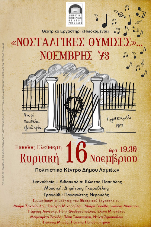 Το Δημοτικό Περιφερειακό Θέατρο Ρούμελης και το Θεατρικό Εργαστήρι «Ηλιοκαμένοι» παρουσιάζουν την θεατρική – μουσική παράσταση «Νοσταλγικές Θύμισες… Νοέμβρης ‘73», την Κυριακή 16 Νοεμβρίου, στις 19:30, στο Πολιτιστικό Κέντρο του Δήμου Λαμιέων, που βρίσκεται στην οδό Λεωνίδου 9-11.