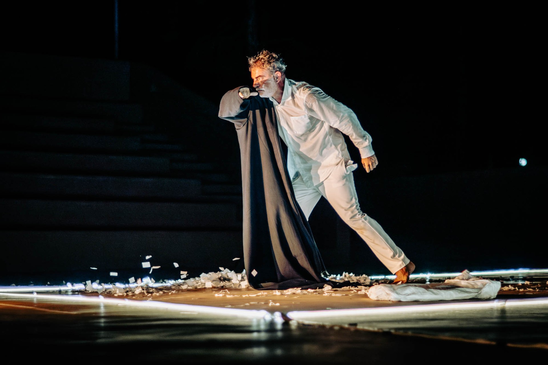 Η παράσταση, σε σκηνοθεσία της Έλενας Αγγελοπούλου, φωτίζει την υπαρξιακή αγωνία του ήρωα µε τα εργαλεία του σύγχρονου θεάτρου: ηλεκτρονική μουσική, διαρκή κίνηση, έντονο ρυθµό, ηχητικά – κινηµατογραφικά τοπία και το φως δυνατό συμπαίκτη. Στοιχεία που αναδεικνύουν το μεγάλο ερώτημα της αναζήτησης του νοήματος της ύπαρξης.