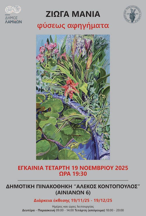 Ο Δήμος Λαμιέων και η Δημοτική Πινακοθήκη Λαμίας «Αλέκος Κοντόπουλος» εγκαινιάζουν την Έκθεση Ζωγραφικής με τίτλο: «Φύσεως Αφηγήματα» της εικαστικού Μάνιας Ζιώγα, με επιμελητή της Έκθεσης τον γλύπτη Γεράσιμο Καραντινό, στην κύρια αίθουσα της Δημοτικής μας Πινακοθήκης την Τετάρτη 19 Νοεμβρίου και ώρα 19:30.