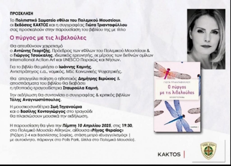 Είναι σπάνιες εκείνες οι περιπτώσεις που η εσωτερική ομορφιά συνδυάζεται με την εξωτερική και η αφηγηματική ικανότητα με την αυτογνωσία της μετριοφροσύνης. Και η Γιώτα Τριανταφύλλου είναι μία από αυτές. Μια λογοτέχνις, που έχοντας ως κύρια ενασχόληση τον εσωτερισμό της ποίησης, έκανε πρόσφατα τα πρώτα της βήματα στον κόσμο του μυθιστορήματος με το έργο «Ο πύργος με τις λιβελούλες», που κυκλοφορεί από τις εκδόσεις Κάκτος. Αυτές ακριβώς οι λιβελούλες «φωλιάζουν» την Πέμπτη 10 Απριλίου 2025 και ώρα 19.30 στην αίθουσα «Ρήγας Φεραίος» του Πολεμικού Μουσείου Αθηνών, όπου θα γίνει παρουσίαση του βιβλίου. Θα απευθύνουν χαιρετισμό ο Αντώνης Γκορτζής, Πρόεδρος των «Φίλων του Πολεμικού Μουσείου» και ο Γιώργος Τσούκαλης, ιδιωτικός ερευνητής, εκ μέρους των διεθνών ομίλων International Action Act και UNESCO Πειραιώς και Νήσων. Για το βιβλίο θα μιλήσει ο Ιωάννης Καμνής, Αντιστράτηγος ε.α. νομικός MSc Κοινωνικής Ψυχιατρικής.