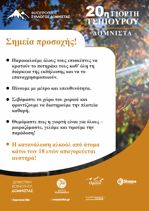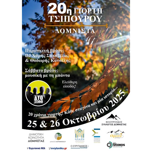 Το διήμερο 25-26 Οκτωβρίου θα πραγματοποιηθεί στη Δομνίστα Ευρυτανίας η 20η Γιορτή Τσίπουρου
