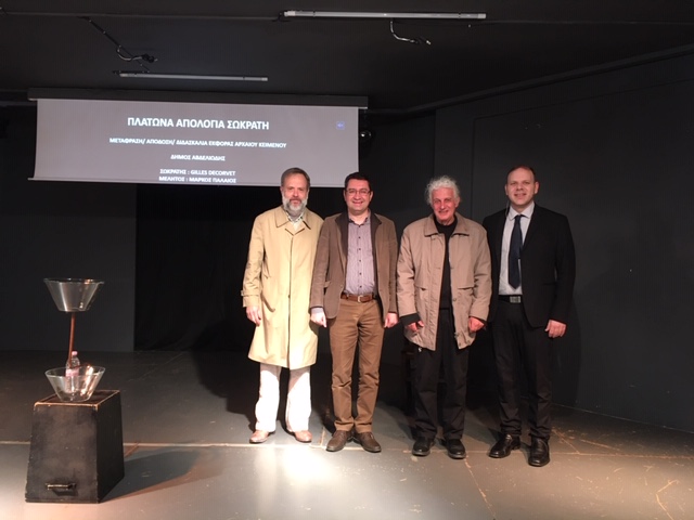 Ο Δήμαρχος Λοκρών κ. Αθανάσιος Ζεκεντές απηύθυνε σύντομο χαιρετισμό στον οποίο τόνισε την σημαντικότητα της επιχειρηματολογίας που χρησιμοποίησε ο Σωκράτης για να υποστηρίξει την αθωότητα του στους δικαστές, χωρίς να κάνει χρήση ψεύδους ή δόλου. Από το Δήμο Λοκρών παρευρέθηκαν η Αντιδήμαρχος Παιδείας κ. Γιούλη Καζάνα, η Αντιδήμαρχος Κοινωνικής Πολιτικής και Προστασίας κ. Αθανασία Βλαχομήτρου, οι εκπαιδευτικοί και οι μαθητές του Γυμνασίου και Γενικού Λυκείου Αταλάντης. Η συγκεκριμένη παράσταση προσφέρθηκε από το Δήμο Λοκρών στους μαθητές στο πλαίσιο της εξοικείωσης τους με τα αρχαία ελληνικά και την ελληνική φιλοσοφία.