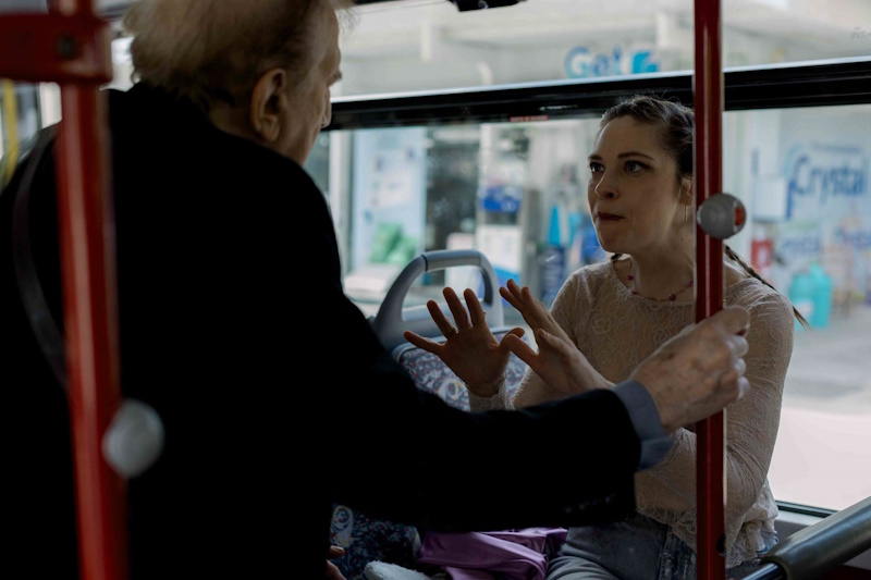 Στη μικρού μήκους ταινία “Blue Bus”, μια νεαρή γυναίκα προσπαθεί να φτάσει εγκαίρως σε μια σημαντική για εκείνη οντισιόν, όταν η έλλειψη εισιτηρίου και τα 10 λεπτά που της λείπουν την φέρνουν αντιμέτωπη με έναν αυστηρό και σχολαστικό ελεγκτή εισιτηρίων. Η αγωνιώδης προσπάθειά της να καλύψει το ποσό των δέκα λεπτών προκαλεί μια σειρά από τραγελαφικές στιγμές, όπου οι αντιφάσεις και η τυπολατρία του ελεγκτή συγκρούονται με την απελπισία της γυναίκας.