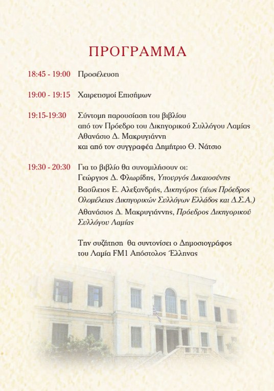 Ο Δικηγορικός Σύλλογος Λαμίας παρουσιάζει το βιβλίο του «Δικηγόροι και Δικηγορικός Σύλλογος Λαμίας (1833-2024)», την Παρασκευή 20 Ιουνίου 2025 και ώρα 19:00 στο ξενοδοχείο ”Mitsis Galini”, στα Καμένα Βούρλα.