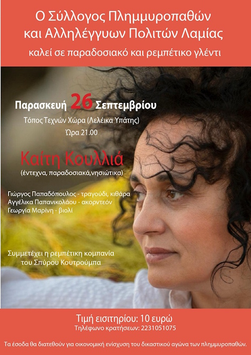Ο Σύλλογος Πλημμυροπαθών και Αλληλέγγυων Πολιτών Λαμίας καλεί σε παραδοσιακό και ρεμπέτικο γλέντι με την Καίτη Κουλλιά σε έντεχνα, παραδοσιακά, νησιώτικα τραγούδια, την Παρασκευή 26 Σεπτεμβρίου 2025 στον Τόπο Τεχνών Χώρα, στα Λελέικα Υπάτης.