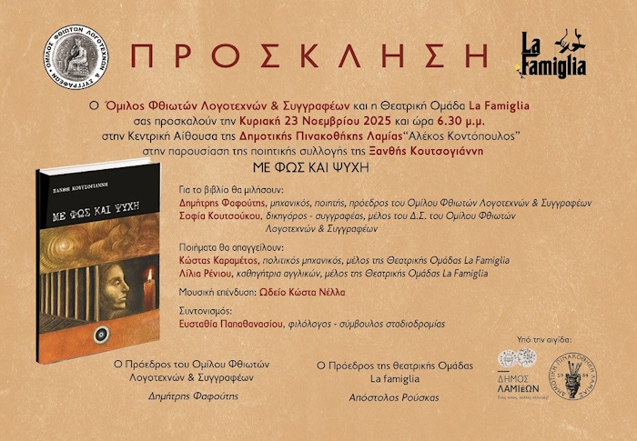 O Όμιλος Φθιωτών Λογοτεχνών & Συγγραφέων και η Θεατρική Ομάδα La Famiglia, παρουσιάζουν την ποιητική συλλογή ”Με Φως και Ψυχή” της Ξανθής Κουτσογιάννη την Κυριακή 23 Νοεμβρίου 2025 και ώρα 6.30 μ.μ. στην Κεντρική Αίθουσα της Δημοτικής Πινακοθήκης Λαμίας “Αλέκος Κοντόπουλος”.