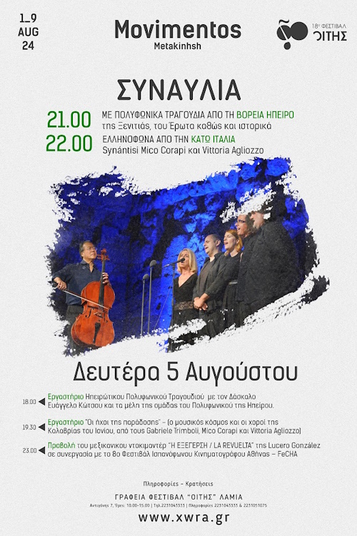 Το 18ο Φεστιβάλ Οίτης και η πλατφόρμα MOVIMENTOS από 1 έως 7 Αυγούστου σάς προσκαλούν σε ένα ξεχωριστό ταξίδι στη Μεσόγειο! Με αφετηρία τον Τόπο Τεχνών «Χώρα» στα Λελέικα Υπάτης, κάθε βράδυ ξεκινάμε για ένα ταξίδι σε μια διαφορετική χώρα της Μεσογείου με όχημα τη μουσική και τις εικόνες!