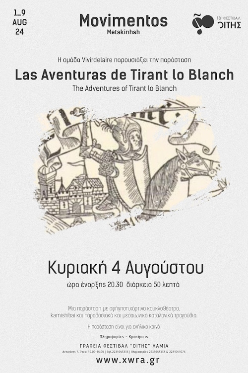 Παράσταση από την ομάδα Vivirdelaire «Οι περιπέτειες του Tirant lo Blanch (σε ελεύθερη απόδραση!)», ώρα έναρξης 8.30 μ.μ., διάρκεια 50 λεπτά