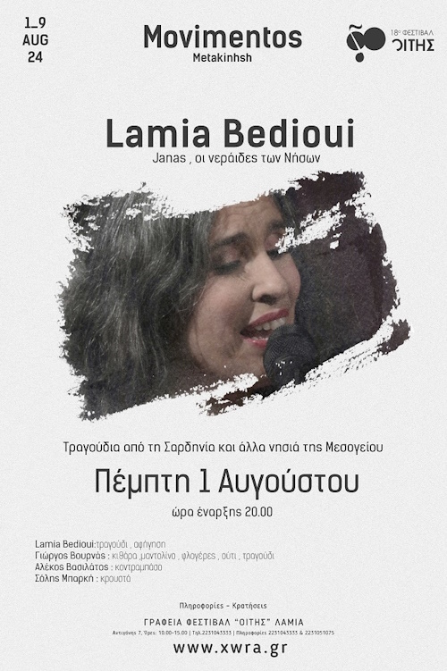 Ιστορίες, παραμύθια και τραγούδια από την παράδοση της Τυνησίας με την Τυνήσια τραγουδίστρια και αφηγήτρια Lamia Bedioui ώρα έναρξης 10 μ.μ. – ΕΙΣΟΔΟΣ ΕΛΕΥΘΕΡΗ