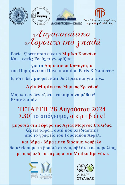 Διοργανώνουν στις 28 Αυγούστου ένα Λογοτεχνικό Γκαλά, αφιερωμένο στη Λαμιώτισσα Συγγραφέα, Καθηγήτρια του Παριζιάνικου Πανεπιστημίου Paris X Nanterre, Μιμίκα Κρανάκη. Ανηψιά του Δημάρχου Λαμίας Ιωάννη Μακροπούλου, η Μιμίκα Κρανάκη μεγάλωσε κοντά του, περνούσε τα καλοκαίρια της στην Αγία Μαρίνα Στυλίδας, αγάπησε πολύ αυτό το ψαροχώρι και, καταγράφοντας την καθημερινή ζωή των Αγιαμαρινιωτών, έγραψε την κλασσική θαλασσινή νουβέλα Όταν καπνίζει ο Λουλάς, που αφιέρωσε στον αγαπημένο της Αγιαμαρινιώτη, τον μπάρμπα-Αντρέα… Αποσπάσματα της νουβέλας θα διαβαστούν στη διάρκεια ενός μικρού, λογοτεχνικού περιπάτου στην παραλία της Αγίας Μαρίνας, από τη Γέφυρα μέχρι το πανέμορφο λιμανάκι της, πίσω από την εκκλησία της Αγίας Μαρίνας. Ενώ, επιστρέφοντας στη μεγάλη προβλήτα, θα προβληθεί video αφιερωμένο επίσης στην Αγία Μαρίνα και τη Μιμίκα Κρανάκη, σε ένα Καρέ-Καρέ με τις Μούσες και τις Χάριτες…