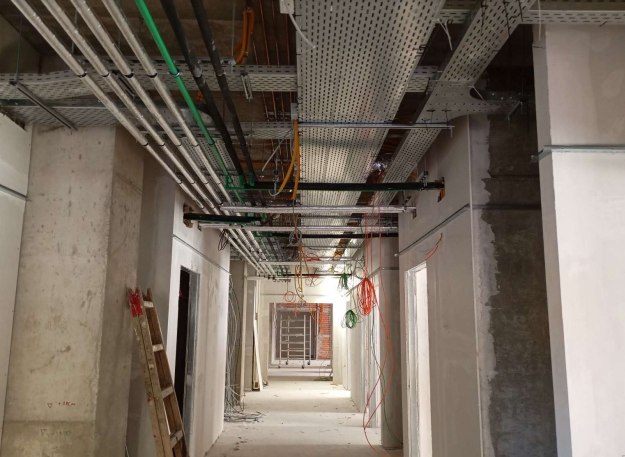 Στα τρία πρώτα επίπεδα εκτελούνται εργασίες εγκατάστασης ηλεκτρομηχανολογικών δικτύων και αρχιτεκτονικές εργασίες κατασκευής εσωτερικών τοιχοποιιών από ξηρά δόμηση.