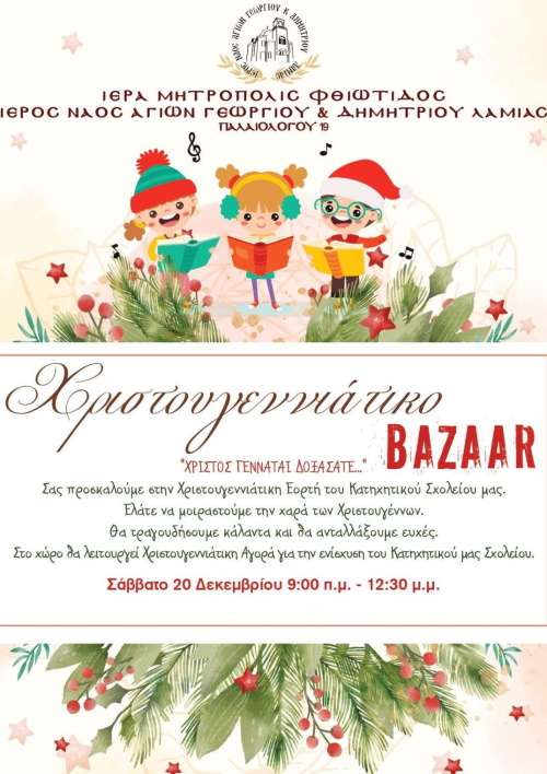 Στον Ιερό Ναό Αγίου Δημητρίου Λαμίας διοργανώθηκε Χριστουγεννιάτικο Bazaar από το Κατηχητικό Σχολείο. Στο χώρο λειτούργησε Χριστουγεννιάτικη Αγορά για την ενίσχυση του Κατηχητικού Σχολείου.
