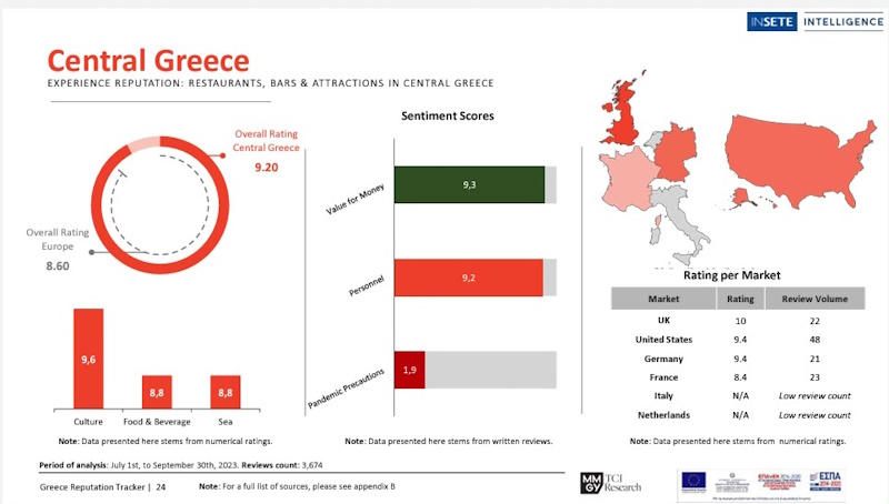 Σύμφωνα με έρευνα από το INSETE Intelligence με τίτλο: «Η φήμη της Ελλάδας και της κάθε Περιφέρειας στα κοινωνικά δίκτυα και τις ιστοσελίδες ταξιδιών – Q2 2024», που διεξήχθη στο πλαίσιο παρακολούθησης της τουριστικής δραστηριότητας μέσα από διαφοροποιημένες πηγές, και σε συνεργασία με την εταιρεία TCI Research (που πλέον αποτελεί τμήμα της εταιρείας MMGY) σχετικά με τη συλλογή big data για την Ελλάδα και ανταγωνιστικούς προορισμούς (Ιταλία, Ισπανία, Πορτογαλία, Κροατία) που επιτρέπει τη σύγκριση της συνολικής εικόνας της χώρας και της Αθήνας με τον ανταγωνισμό η Ελλάδα συνολικά, η κάθε Περιφέρεια ξεχωριστά αλλά και η Περιφέρεια Στερεάς Ελλάδας, διατήρησαν την ανταγωνιστικότητά τους, ως προς την εμπειρία επίσκεψης, με βαθμολογία υψηλότερη από τον ευρωπαϊκό μέσο όρο, επιβεβαιώνοντας τις δυνατότητες που υπάρχουν για τη χρονική και χωρική επέκταση της τουριστικής δραστηριότητας.