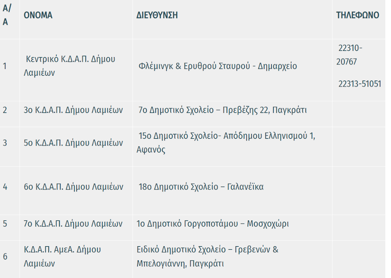 Στο Δήμο Λαμιέων τα ΚΔΑΠ που συμμετέχουν στο πρόγραμμα είναι τα παρακάτω: