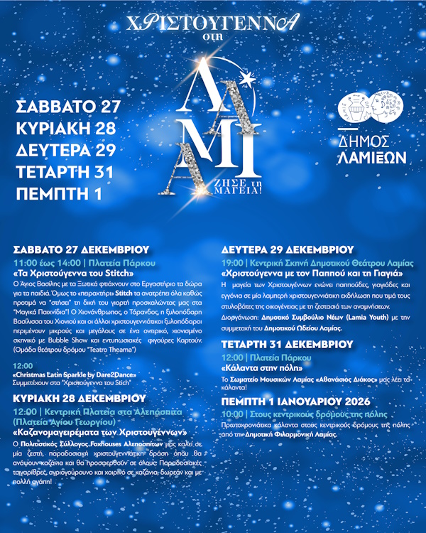 Ανακοινώθηκε το πρόγραμμα εορταστικών εκδηλώσεων για το διάστημα από 22 έως 28 Δεκεμβρίου από τον Δήμο Λαμιέων.