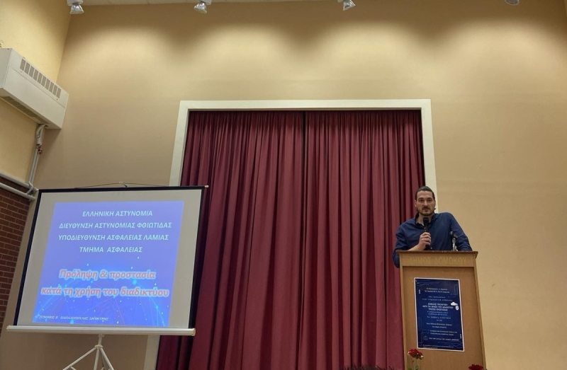 Ο εισηγητής της εσπερίδας κ. Δημήτριος Παπαδόπουλος, Αστυνόμος Β’ της Υποδιεύθυνσης Ασφάλειας Λαμίας, συνέβαλε στην ευαισθητοποίηση και την πληροφόρηση για την ασφαλή χρήση του διαδικτύου συμβάλλοντας στην ενίσχυση της κριτικής σκέψης στην ψηφιακή κοινωνία και στην ανάπτυξη θετικής συμπεριφοράς στη χρήση του διαδικτύου. Επίσης, ο κ. Παπαδόπουλος παρείχε χρήσιμες συμβουλές για τους κινδύνους που ελλοχεύουν από την λανθασμένη χρήση του διαδικτύου, ενώ με ιδιαίτερη έμφαση τονίστηκαν τα επικίνδυνα φαινόμενα που αναπτύσσονται μέσω της εσφαλμένης χρήσης, όπως ο εκφοβισμός, η αποπλάνηση, η αποξένωση και η υποκλοπή προσωπικών στοιχείων.