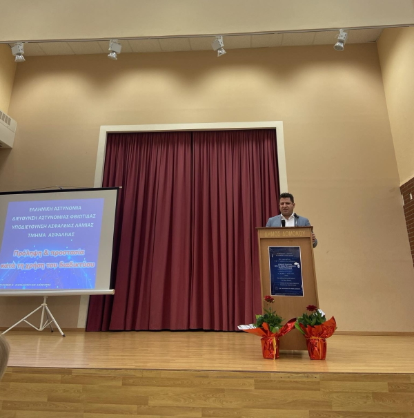 Ο εισηγητής της εσπερίδας κ. Δημήτριος Παπαδόπουλος, Αστυνόμος Β’ της Υποδιεύθυνσης Ασφάλειας Λαμίας, συνέβαλε στην ευαισθητοποίηση και την πληροφόρηση για την ασφαλή χρήση του διαδικτύου συμβάλλοντας στην ενίσχυση της κριτικής σκέψης στην ψηφιακή κοινωνία και στην ανάπτυξη θετικής συμπεριφοράς στη χρήση του διαδικτύου. Επίσης, ο κ. Παπαδόπουλος παρείχε χρήσιμες συμβουλές για τους κινδύνους που ελλοχεύουν από την λανθασμένη χρήση του διαδικτύου, ενώ με ιδιαίτερη έμφαση τονίστηκαν τα επικίνδυνα φαινόμενα που αναπτύσσονται μέσω της εσφαλμένης χρήσης, όπως ο εκφοβισμός, η αποπλάνηση, η αποξένωση και η υποκλοπή προσωπικών στοιχείων.