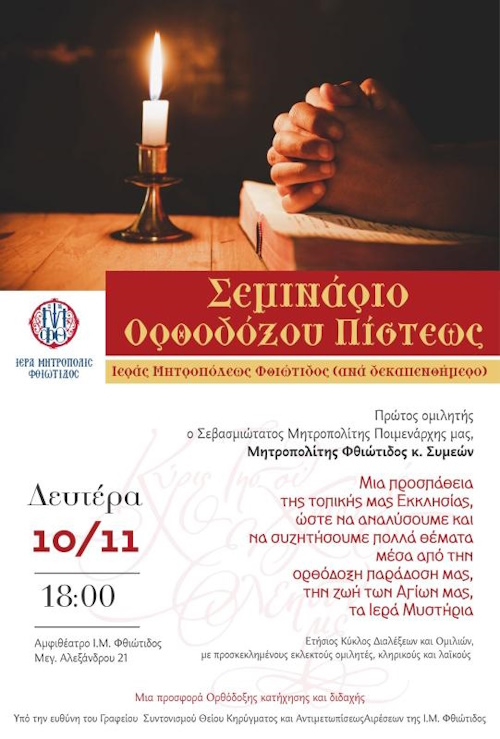 Η Ιερά Μητρόπολη μας βρίσκεται στην ευχάριστη θέση να ανακοινώσει, ότι κατά τήν φετινή εκκλησιαστική χρονιά και στα πλαίσια της πνευματικής προσφοράς και κατήχησης, θα διοργανωθεί μια νέα ιεραποστολική προσπάθεια, το Σεμινάριο Ορθοδόξου Πίστεως, με πρωτοβουλία του Σεβασμιωτάτου Ποιμενάρχου μας, Μητροπολίτου Φθιώτιδος κ. Συμεών.