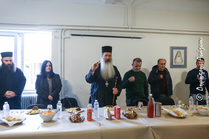 «Από αύριο ξεκινά μία νέα πνευματική περίοδος για την Εκκλησία μας, που είναι η προετοιμασία μας για τα Άγια Χριστούγεννα, η νηστεία των Χριστουγέννων και έτσι σήμερα παραμονή αυτής της έναρξης της νέας προσπάθειας, έχουμε Αποκριά. Αφενός μεν το βράδυ γιορτάζουμε την Αποκριά στον Δομοκό στο πλαίσιο του προγράμματός μας «Όλη η Φθιώτιδα μια οικογένεια», αλλά σήμερα το μεσημέρι γιορτάζουμε την Αποκριά μαζί με τα παιδιά, με τους μαθητές, οι οποίοι φοιτούν στο Πρότυπο Εκκλησιαστικό Γυμνάσιο – Λύκειο «Ο Όσιος Βησσαρίων ο Αγαθωνίτης» και διαμένουν στον ξενώνα των μαθητών της Εκκλησιαστικής Εστίας της Μητροπόλεως μας. Έχουμε την χαρά σήμερα να γευματίσουμε μαζί, να καμαρώσουμε τα παιδιά για την πρόοδό τους, να ευχαριστήσουμε τον Διευθυντή του Σχολείου, τον κ. Ζαχαράκη και όλους τους εκπαιδευτικούς, για το έργο το οποίο επιτελούν, τον Διευθυντή της Εστίας π. Ηρωδίωνα Ρίζο, τον επιμελητή της Εστίας π. Δαμασκηνό Καρδαρά και απόφοιτο της Σχολής, και να ευχηθούμε καλά και ευλογημένα Άγια Χριστούγεννα.
