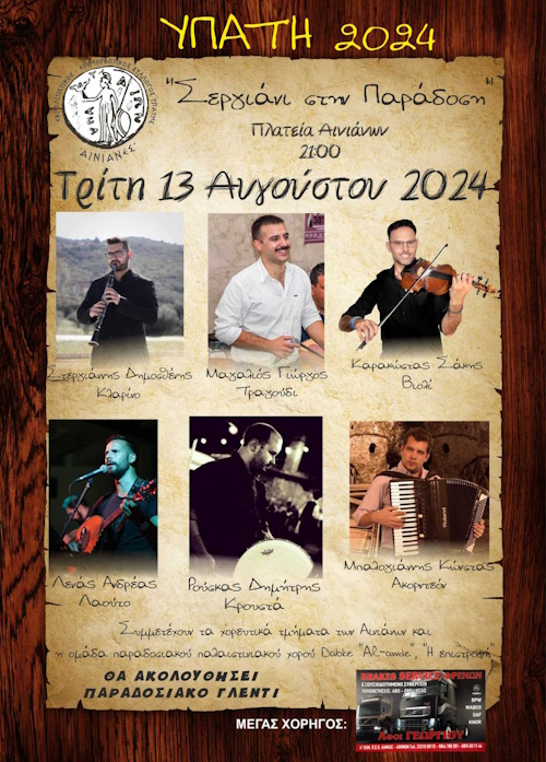 Ο Εκπολιτιστικός – Επιμορφωτικός Σύλλογος Υπαταίων «Οι Αινιάνες» σας προσκαλεί να συμμετάσχετε στο Φεστιβάλ Πολιτισμού «Υπάτη 2024», ένα από τα παλαιότερα φεστιβάλ πολιτισμού στην Φθιώτιδα, που διοργανώνεται από τις 10 έως τις 24 Αυγούστου 2024 στην Υπάτη.
