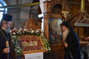 Θέλω λοιπόν να εκφράσω αυτή τη χαρά και κυρίως θα ήθελα να μην ξεχάσουμε ποτέ, ότι ο λαός μας πολύ σοφά ονομάζει αυτή την εορτή «Πάσχα του καλοκαιριού» γιατί όντως γιορτάζουμε Ανάσταση, γιορτάζουμε το γεγονός ότι η Παναγία μας δεν χωρίστηκε ποτέ από τον Χριστό μας, γι’ αυτό δεν είναι τυχαίο ότι στην εικόνα της Κοιμήσεως εικονίζεται και ο Χριστός να είναι επικεφαλής στο νεκρικό κρεββάτι, στο οποίο στέκεται η Παναγία μας, βρίσκεται εκεί, μαζί και οι Απόστολοι και άλλες σημαίνουσες προσωπικότητες, αλλά κυρίως είναι παρών ο Χριστός, γιατί ο θάνατός Της, η Κοίμησή Της δεν είναι ένας χωρισμός από τον Υιό Της, αλλά είναι το αποκορύφωμα της ένωσής Της μαζί Του.