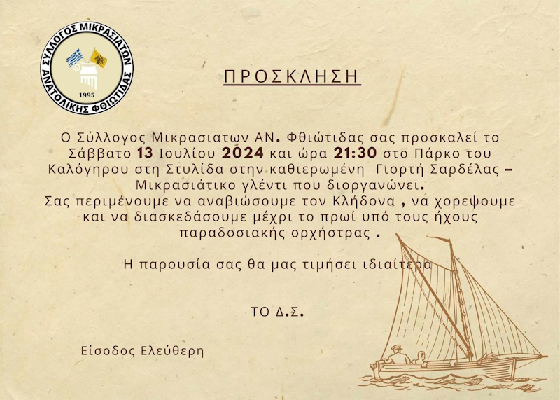 Ο Σύλλογος Μικρασιατών Ανατολικής Φθιώτιδας σας προσκαλεί στην εκδήλωση «Αναβίωση εθίμου του Κλήδονα–Γιορτή Σαρδέλας- Μικρασιάτικο γλέντι » που διοργανώνει το Σάββατο 13 Ιουλίου 2024 και ώρα 21:30 στο Πάρκο του Καλόγερου στην Στυλίδα.