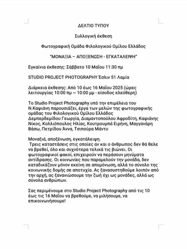 Η Φωτογραφική Ομάδα Φιλολογικού Ομίλου Ελλάδας παρουσιάζει στη Λαμία τη συλλογική έκθεση «Μοναξιά-Αποξένωση- Εγκατάλειψη». το Σάββατο 10 Μαΐου στις 11:30 π.μ. στο STUDIO PROJECT PHOTOGRAPHY, Έσλιν 51, Λαμία.