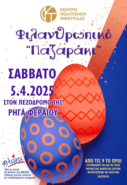 Το Κέντρο Πολιτισμού Φθιώτιδας διοργανώνει καθιερωμένο Πασχαλινό Φιλανθρωπικό Παζάρι το Σάββατο 5 Απριλίου στον πεζόδρομο της Ρήγα Φεραίου, από τις 9 το πρωί μέχρι αργά το απόγευμα, με χειροποίητες λιχουδιές και ανοιξιάτικες κατασκευές, αλλά και πολύ κέφι και χαμόγελα!