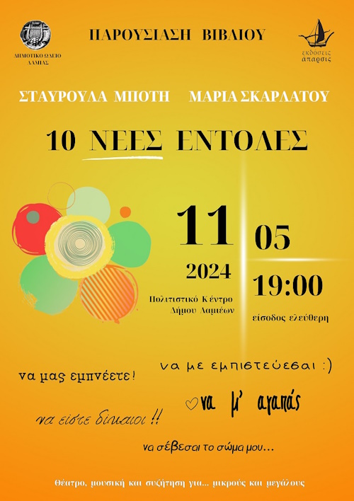 Το Δημοτικό Ωδείο Λαμίας σε συνδιοργάνωση με τον εκδοτικό οίκο Άπαρσις, σάς προσκαλούν στην παρουσίαση του εκπαιδευτικού – καλλιτεχνικού βιβλίου «10 νέες εντολές» των συγγραφέων Σταυρούλα Μπότη και Μαρία Σκαρλάτου, το Σάββατο 11 Μαΐου 2024 και ώρα 19:00, στο Πολιτιστικό Κέντρο Δήμου Λαμιέων.